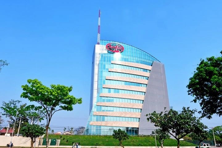 La fachada principal se resuelve mediante una piel curva continua de vidrio, complementada por franjas horizontales que integran funciones interiores y se revisten exteriormente en mármol, aportando materialidad y peso institucional. En el extremo norte se incorpora una celosía vertical de aluminio que controla la radiación solar en horarios críticos y enfatiza la verticalidad del volumen.