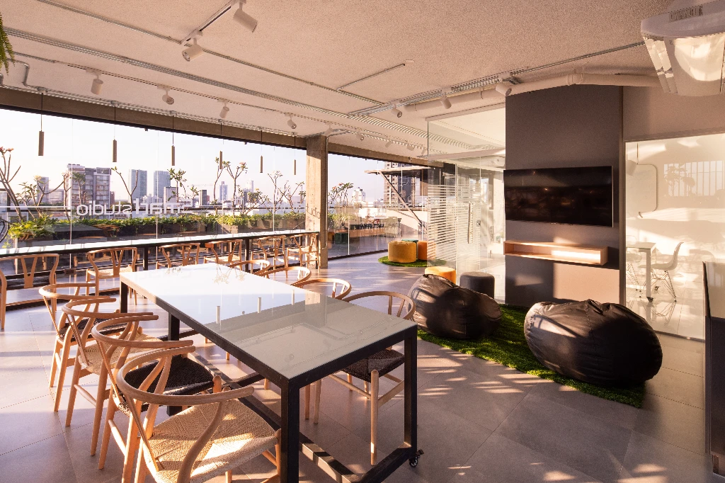 Los seis niveles superiores concentran departamentos y estudios compactos, organizados bajo criterios de eficiencia espacial y racionalidad estructural. La terraza común constituye el remate programático del edificio, integrando dos piscinas, churrasqueras, salas de lujo de uso común, áreas de cowork, lavanderías compartidas y espacios abiertos de esparcimiento, configurando un plano elevado de interacción social y comunitaria.